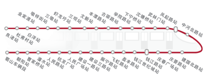 地铁2号线东南段线路南起萧山区的朝阳站,基本沿市心路走行,穿越钱塘江后,止于钱江新城的钱江路站,全长18.3公里,设13座地下车站,1个车辆段(蜀山车辆段),1座主变电所(建设一路主变)。地铁2号线东南段规划设有5座换乘车站,分别与地铁4、5、6号线以及远期规划的7、9、11号线进行换乘。其中钱江路站与4号线实现同站台换乘,与远期规划的9号线通道换乘。
