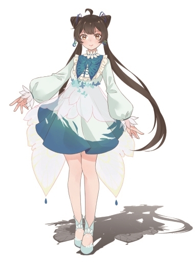 脖颈处被莲花边的立领包裹,承于领口的蝴蝶翅膀设计之上;视线往下,腰部正被莲花群簇,浅绿的泡泡袖用莲花扎紧,内衬尾部是深蓝的一圈水纹,视觉上清秀精致。再往后看,花瓣垂坠,延长到背部,成了蝴蝶形状的裙尾,在走动时既有莲花摇曳,又像一只振翅欲飞的翩翩蝴蝶。